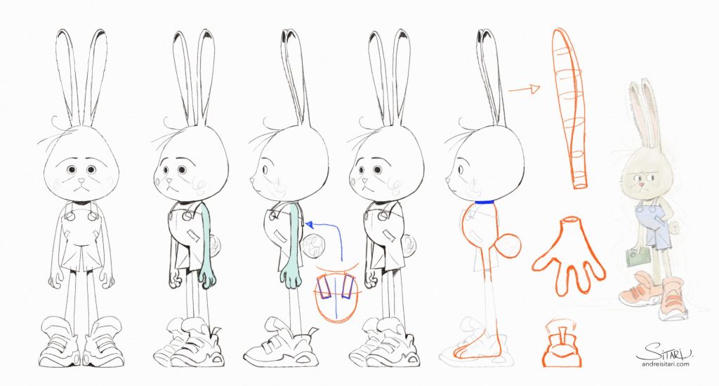 For consistency across each step of the process, the team will design key elements of the project, like characters, props, and backgrounds. They’ll also create color palettes and scene compositions for the production team to reference.